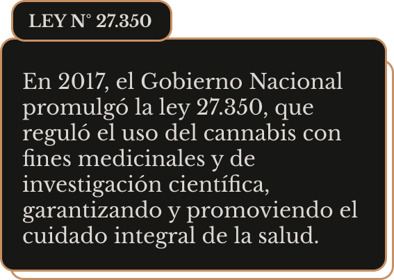En 2017, el Gobierno Nacional promulgó la ley 27.350, que reguló el uso del cannabis, con fines medicinales y de investigación científica, garantizando y promoviendo el cuidado integral de la salud.
